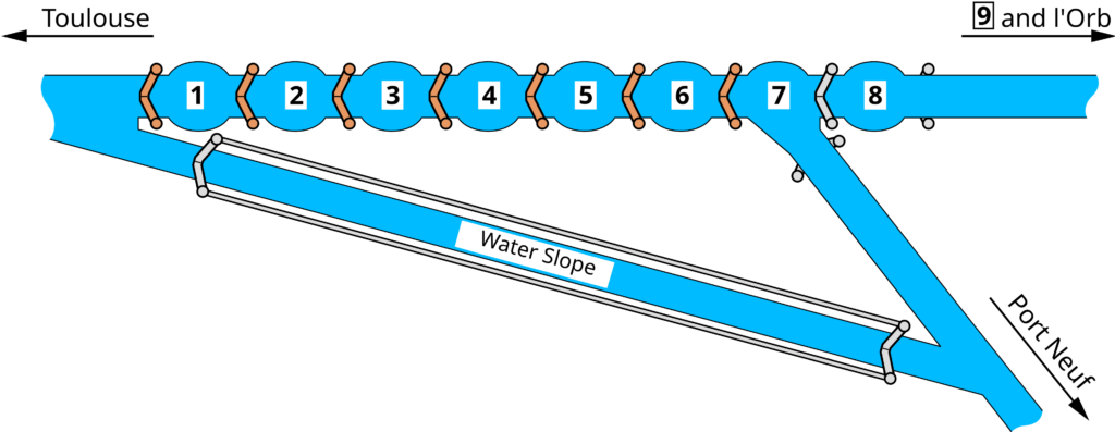 Diagram of the Fonserranes Staircase, we entered at 8 and processed up steam. There is a great deal of controversy whether it’s 7 or 9 locks, depending on the count.