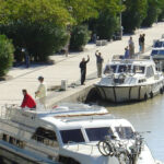 A Barge on the Pont-Canal crossing the Orb River – What a sight! We entered the locks just in time; they closed at 12:15 PM for eastbound boats and did not open eastbound again until after 4 PM. In the multiple lock scenario, rather than pulling lines back into the boat, the crewmember ashore keeps the bow line and walks the line to the next lock, securing it, and then retrieving and securing the stern line as usual. Naturally, there would be a wrinkle if one lock had a bridge over the lock, so the crew had to go all the way back to throwing both the bow and stern lines the 8+ feet up to the side of the quay. We exited the staircase at 1 PM and entered the long pond, so-called 54-kilometer stretch with no locks. Along this stretch are some of the canal’s most graceful and lowest bridges through farmland, vineyards, and plane trees that gracefully shade the canal.