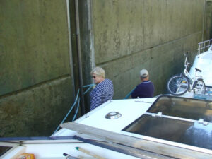 among the first four boats through the lock. The next lock, just 1 ½ km beyond, could only accommodate 2 boats. Our lockmate was a boat captained by a woman from Wales and crewed by women from Australia and New Zealand. They ended up being “lock mates for most of the day.