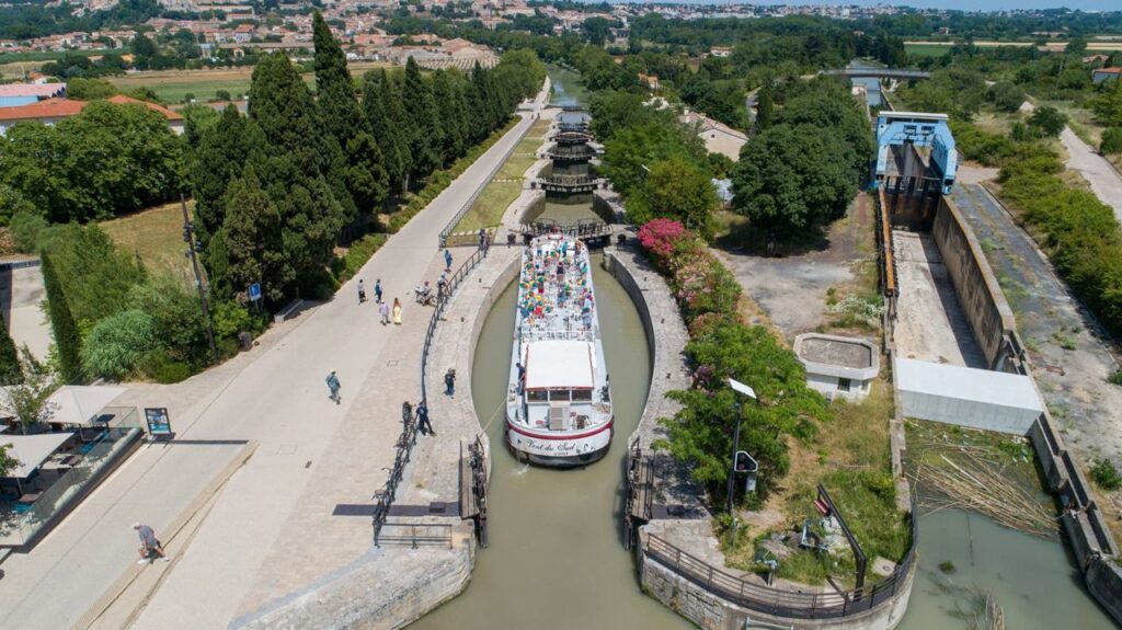 euros, including salad, a plat (either poulet with tagliatelle or tagliatelle with tomato sauce and ground beef), plus dessert (crepe, cheese, or ice cream). We decided to eat big, since it was doubtful we’d find a store open. After all, we could have a dinner of a baguette, cheese, and fruit! We left Colombiers about 4 PM. Just one kilometer out of Colombiers, we encountered the Malpas Tunnel at PK 199. The tunnel is wide enough for only one boat, and you don’t have clear visibility into or through the tunnel to see if anyone else is approaching from the other direction. Even though we sounded our horn and heard no response, as we got closer to the end (exit) of the tunnel, a tour boat tried to enter! A tense moment followed while both captains sorted it out. The tunnel was dug by hand in the 17th century in just 10 days! After a series of blind S-curves, we passed through the village of Poilhes (PK 194). We arrived in Capestang about 5:30 PM, secured a tie-up place on the quay, adjacent to a water faucet for filling up our tank, a daily or every other day requirement. We walked through town, found an open market, and purchased a few necessities, including a plastic jug of local red wine. After a visit to the tourist bureau, we returned to Tamaris for showers and wine. A bird’s-eye view of the Fonserranes Staircase; the locks raise boats over 47 feet through the seven locks in series.