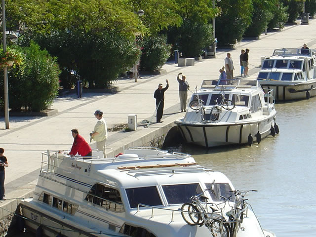 We wait in the basin just below the Fonserranes Staircase, a set of seven locks. We stopped at Colombiers at PK 200.5, tied up to our stakes driven into the side of the bank of the canal. We walked into town and surveyed the harbor. Since it was Sunday, most everything was closed. Since we had not provisioned lunch or dinner items, we searched for a restaurant for lunch and found Pom-Cannelle, a cute harborside cafe with a menu for 12.50