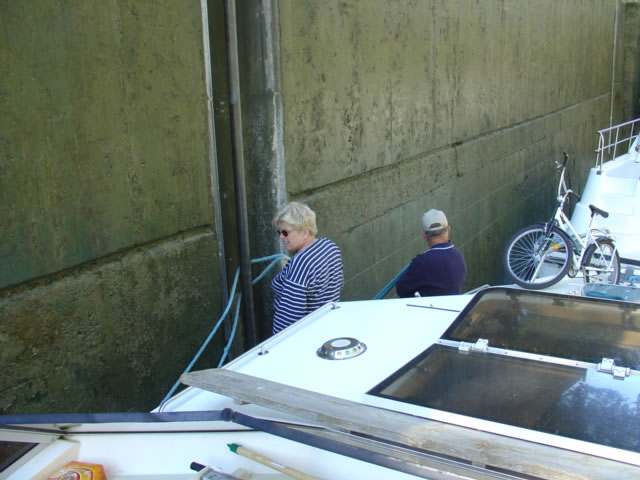 top, we slipped them through pipes running vertically from the top to the bottom of the lock on the stone walls. Shoe and Pat decided they did not like this configuration very much, especially since we had both the bow and stern lines on one pipe to maintain the position of the boat. The rush of water as the locks allowed water to enter made it very difficult to control the position of the boat. Just a short distance later, at PK208, we had the lock to ourselves. We had to wait on the side of the canal while the boats ahead cleared the lock. Much less stressful!