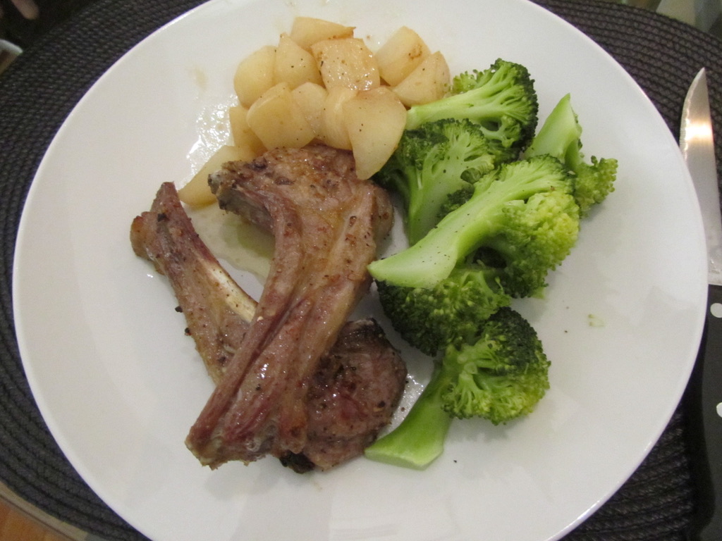 Tonights dinner will consist of Lamb chops we purchased at Saturdays market, broccoli, Â turnip, bread and wine.