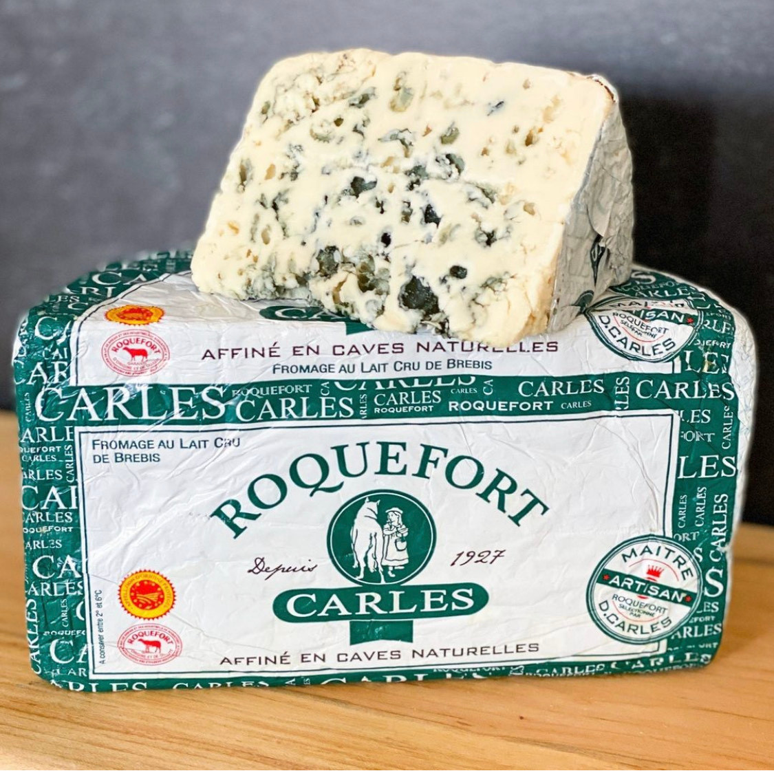 About Roquefort: First evidence of Roquefort was discovered in 79 A.D. when Pliny the Elder mentioned its rich aroma. It was the favorite cheese of Charlemagne. Roquefort is made exclusively from the milk of the red Lacaune ewes that graze on the huge plateau of Rouergue, Causses in the Aveyron. A genuine Roquefort has a red sheep on the label.