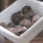 Comté making: Cheesemakers need about 530 liters of milk – the daily production of 30 cows – to make one Comté, weighing approximately 35 kilos (80 pounds). Morning and evening milks from Montbeliarde and Tachete de L’est cows are mixed. Comte requires a long maturing period called affinage. The cheese is regularly cleaned and rubbed with salted water. The eyes – holes – of the Comté are the result of a correct affinage and should be the size of a pea to a small cherry.